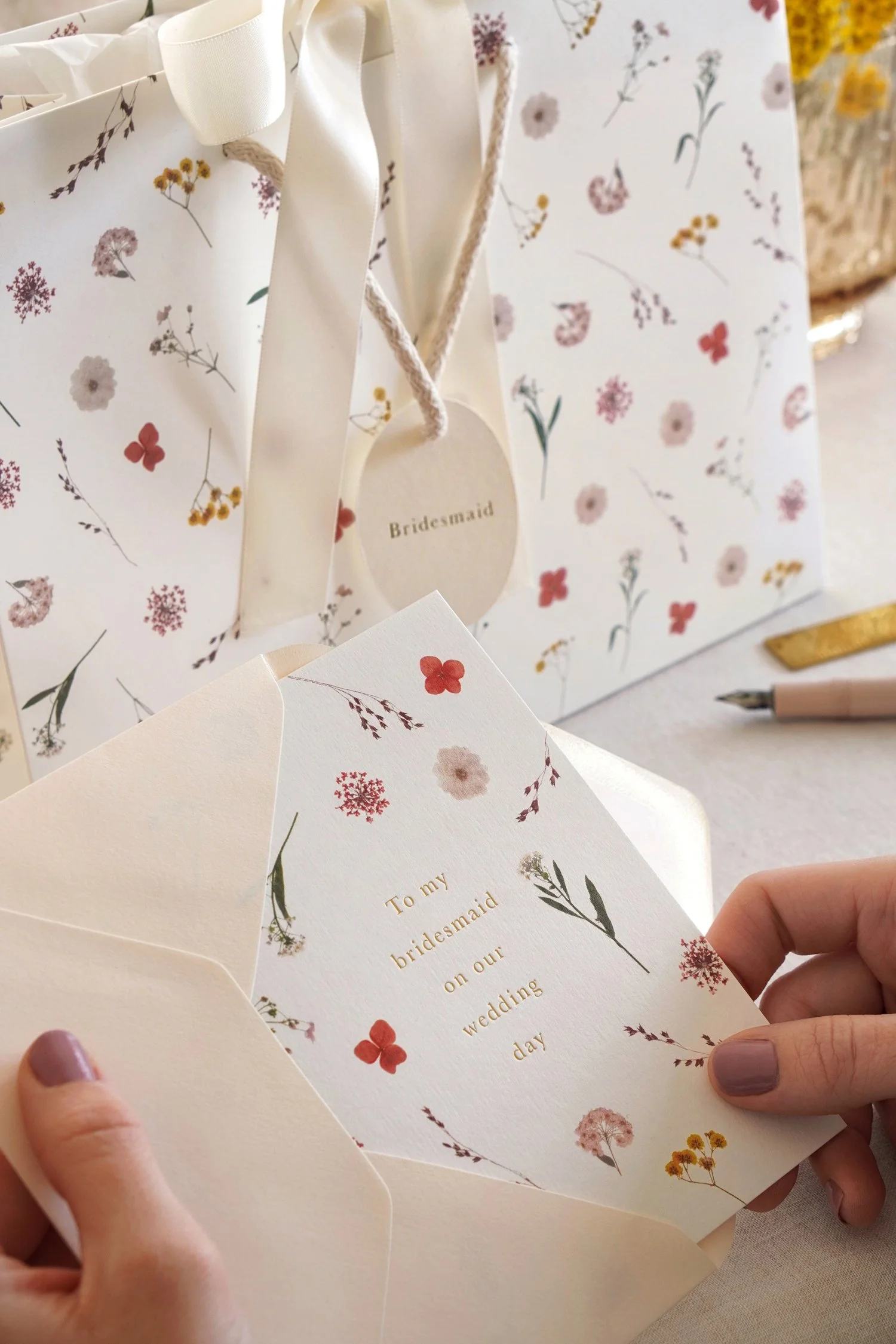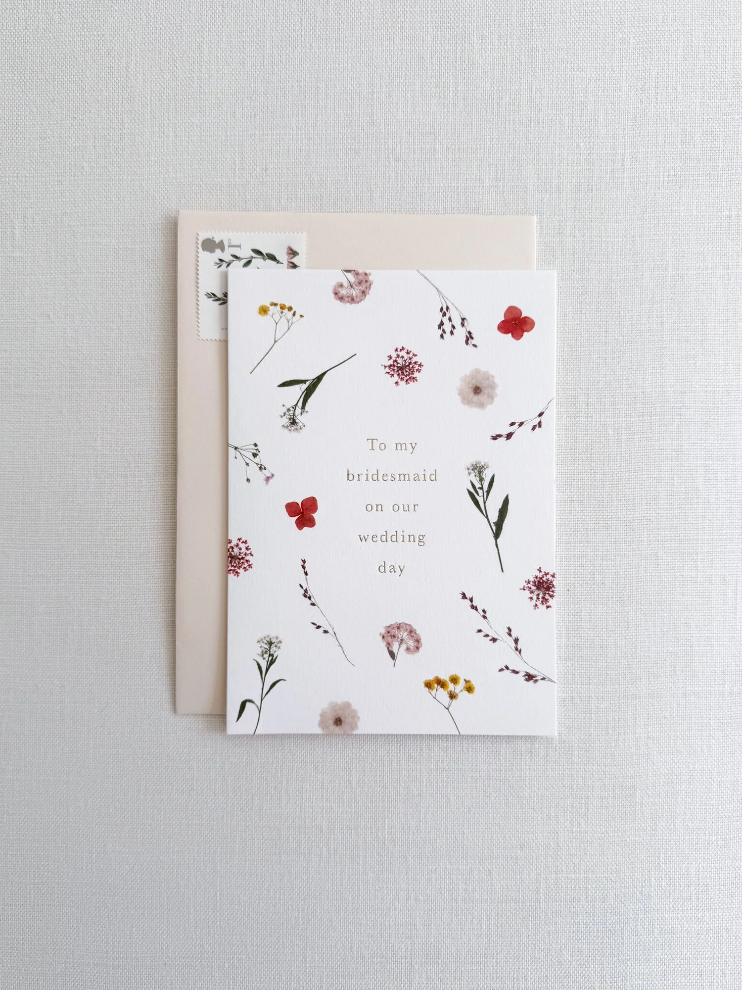 A hand-pressed greeting card with enchanting gold foil pressed wording on a neutral background. Each card is accompanied by a luxurious biscuit-toned envelope. Properly thank your pal with this beautiful card. They deserve it!